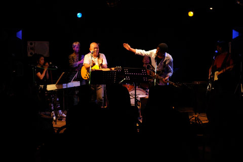 本堂を背に、BLUESを大熱唱する房さんと伝兵衛さん。